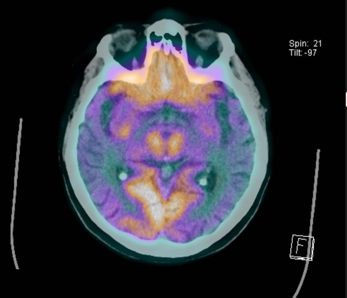 Imagen de PET CT en enfermo con Alzheimer en que las zonas de color naranja son normales, pero extensas zonas de su corteza cerebral no se aprecian